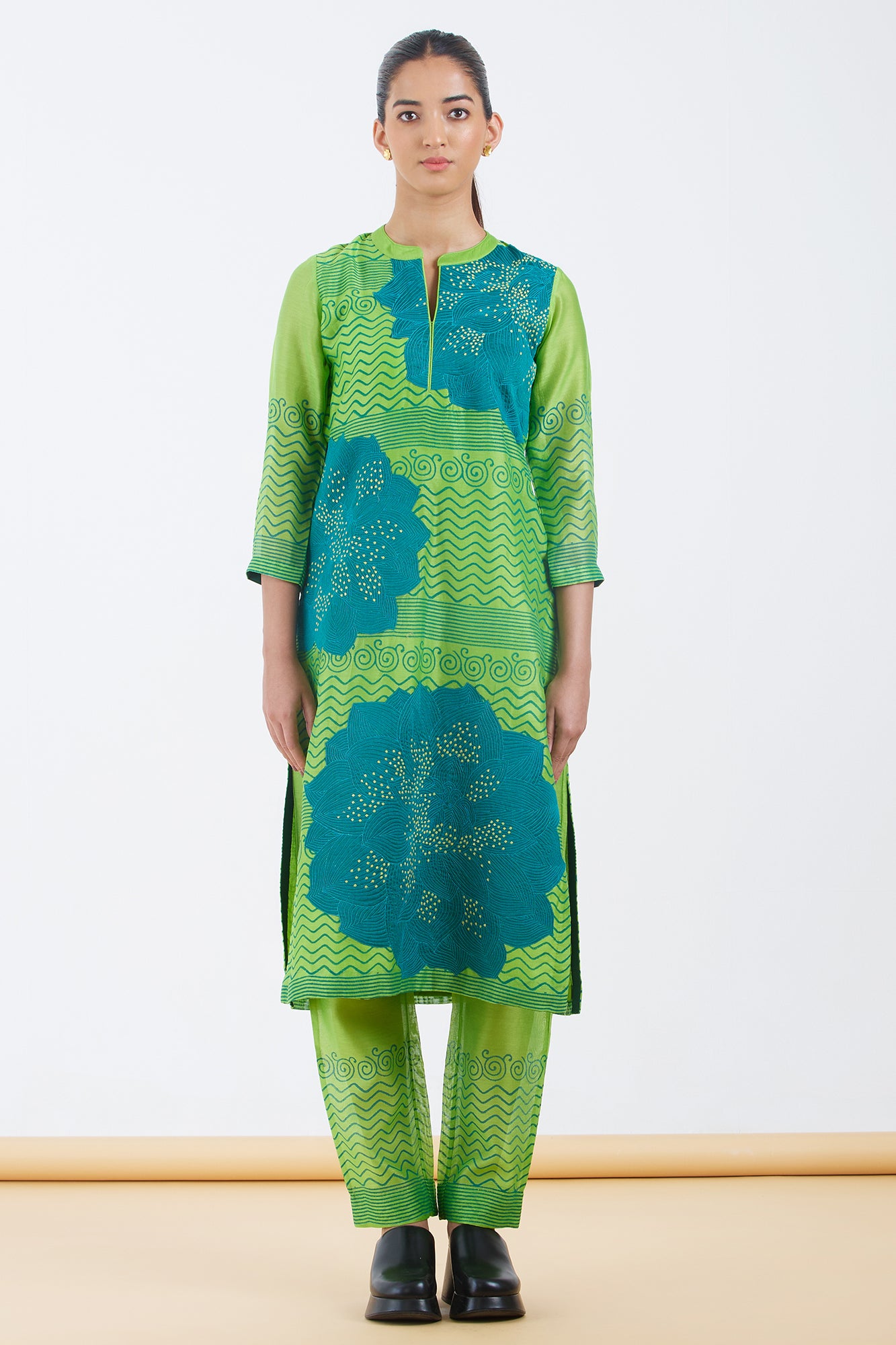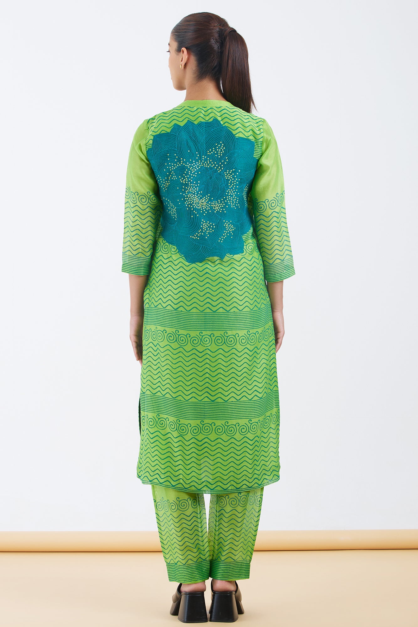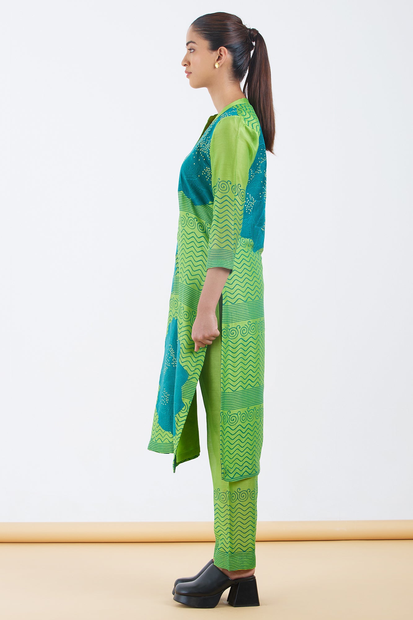 Description :: Silk Chanderi Kurta Set with Block printing and Patchwork intricately outlined with dori work.